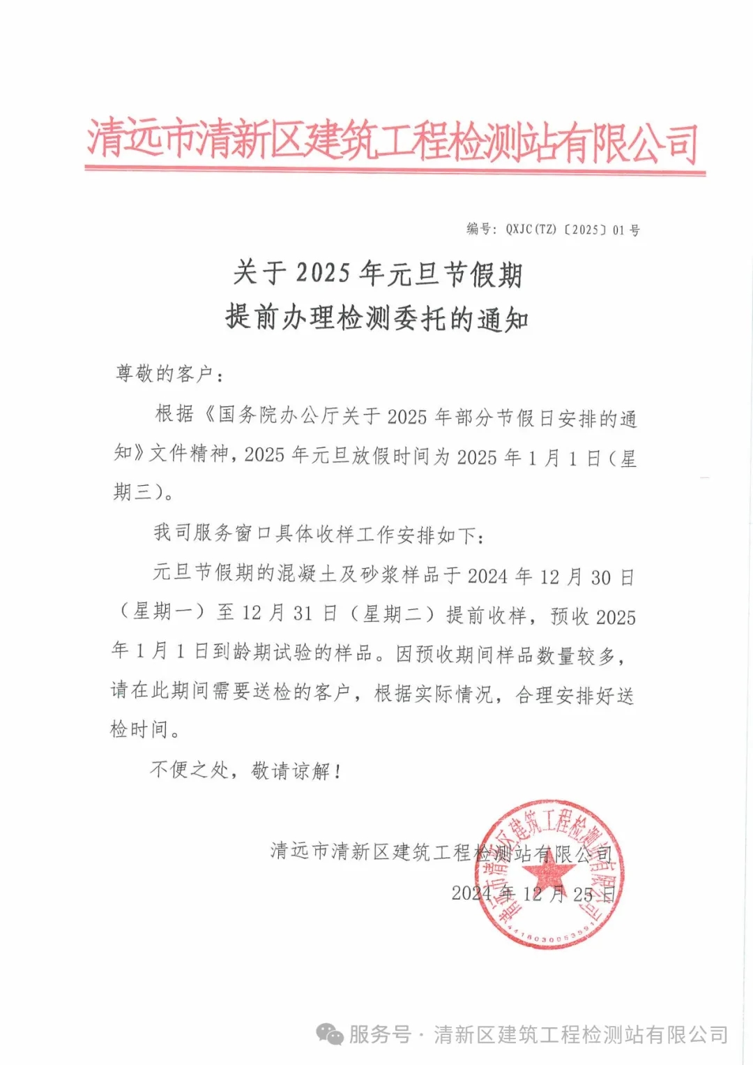 关于 2025 年元旦节假期提前办理检测委托的通知